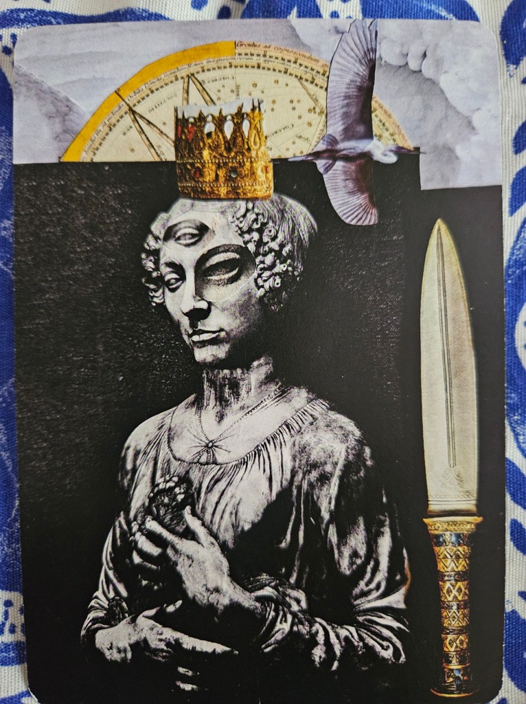 3. What does the collective community surrounding this website most need hear when they find it? Queen of Swords = A woman seeing with all three eyes holds something precious to her chest. At her left arm and slightly behind her stands a knife at attention. She is crowned with the self-assurance & understanding of someone who has an inner sense of knowing. A bird flies past, seemingly close but really in the distance; just the way thoughts can be far away but feel very personal, confrontational and hard to step away from. Try treating your thoughts like a bird flying past someone without much depth perception: objects seem 2Dimensional and it can be very difficult to judge their true distance, so take their proximity with a grain of salt. Give your thoughts space to be more fluid, solid or vaporous, play with them when you feel that you can. It might just keep you able to regulate your mind-field that much easier.
